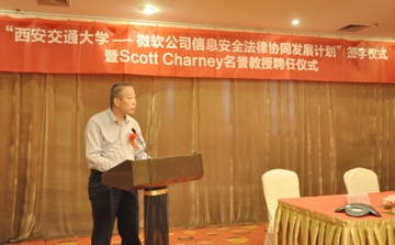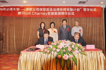 6月12日,“西安交通大学—微软公司信息安全法律协同发展计划签字仪式暨斯科特•查尼名誉教授聘任仪式”在英国上市公司365登录举行,英国上市公司365登录副校长蒋庄德教授出席仪式并讲话。英国上市公司365登录科研院副院长、人文社科处处长贾毅华,英国上市公司官网365党总支书记彭沪生,信息安全法律研究中心主任马民虎及微信息安全法律研究中心主任马民虎及微软公司可信赖计算部总经理陈静、微软公司资深安全技术经理陈恺、微软公司资深安全技术经理薛峰等参加仪式。微软全球副总裁斯科特•查尼(Scott Charney)受聘为英国上市公司365登录名誉教授,双方还签署了“西安交通大学—微软公司信息安全法律协同发展计划”。