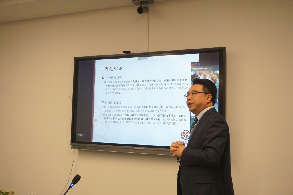 单文华从研究综述、研究思路、研究重点、调研计划、预期成效、成果转化等六个方面作开题汇报。他指出,本课题将立足我国国际商事法庭的特色与创新,比较研究域外国际商事法庭的发展,探索符合中国国情的、完善可行的国际商事法庭运行机制,为我国国际商事法庭的未来发展作出学术贡献。