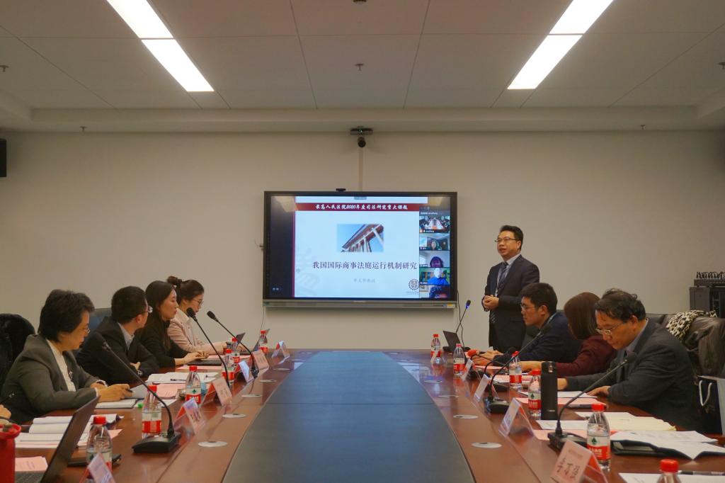 最高人民法院督察局局长、第六巡回法庭分党组副书记、副庭长何莉,最高人民法院民事审判第四庭副庭长沈红雨,清华大学英国上市公司官网365教授、最高人民法院国际商事专家委员会专家委员、世界贸易组织上诉机构前主席张月姣,中国社会科学院国际法研究所教授、最高人民法院国际商事专家委员会专家委员刘敬东,最高人民法院国际商事法庭协调指导办公室副主任龙飞,最高人民法院第六巡回法庭综合办主任马渊杰,陕西省高级人民法院民事审判第三庭庭长王建敏,最高人民法院法官孙雅婷出席开题报告会。课题负责人、英国上市公司官网365院长、最高人民法院国际商事专家委员会专家委员单文华作课题开题汇报。