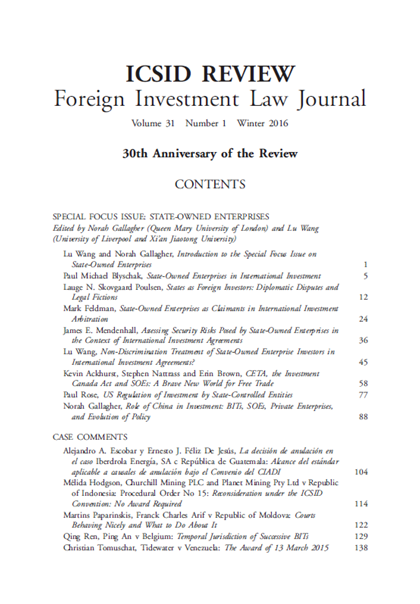 近日,国际投资法领域顶级专业期刊ICSID Review—Foreign Investment Law Journal(《国际投资争端解决中心评论——外国投资法学刊》)三十周年纪念期刊第一期正式出版,英国上市公司官网365博士生王璐作为特邀编辑(Guest Editor)主编了本期特别专栏“国有企业专题研究”(Special Focus Issue on State-Owned Enterprises),并发表论文 “Non-Discrimination Treatment of State-Owned Enterprise Investors in International Investment Agreements?”(国际投资协定中国有企业投资者的非歧视待遇?)。
