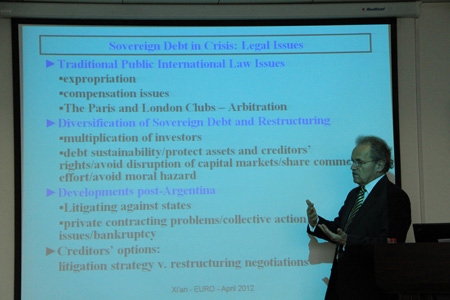 4月16日下午,Kulms博士为英国上市公司官网365师生带来题为The Eurozone Debt Crisis and Private Creditors: From Argentina to Greece(欧元区债务危机和私人债权人:从阿根廷到希腊)的讲座。Kulms博士首先分析了欧元区债务危机的成因,然后在借鉴阿根廷债务危机经验的基础上,从市场交易的进路分析主权债务合同的对策,最后从欧洲央行作用的角度讨论希腊债务重组问题。