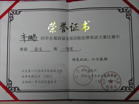 此次比赛吸引了来自北京大学、上海交通大学、中国政法大学、华东政法大学等近70多所高校英国上市公司官网365的选手参加,大会主办方特别邀请了国务院法制办原主任孙婉钟先生以及来自中国社会科学院法学所、中国人民大学英国上市公司官网365等多家高校和研究机构的法律英语专家、教授担纲评委。我院齐鹏同学撰写的英语论文《National Treatment Principle For China's Bilateral Investment In The New Period》在此次大赛中经过激烈角逐荣获国家一等奖,是此次参赛西北地区唯一获得等级奖的论文。