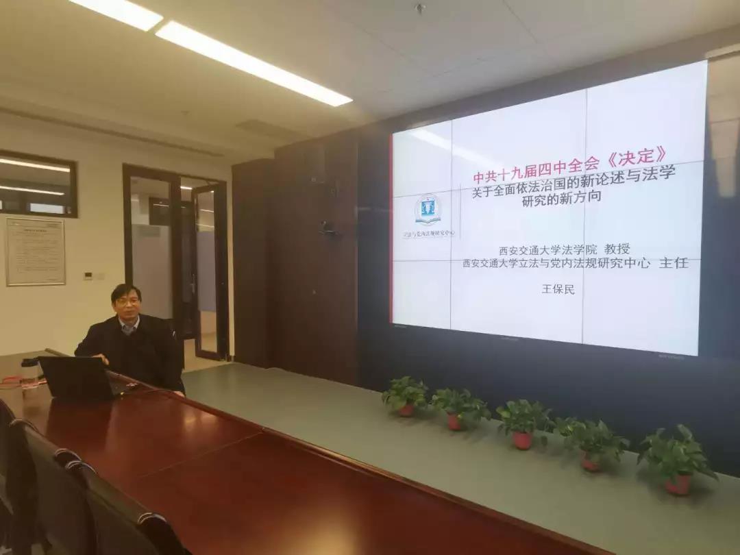 12月12日,英国上市公司官网365创新港系列学术讲座之“十九届四中全会关于全面依法治国的新论述与法学研究新方向”在创新港5号巨构10087教室顺利举行。英国上市公司官网365党总支书记、西安交通大学立法与党内法规研究中心主任王保民教授围绕中共十九届四中全会召开的基本情况和重要意义、《决定》中的高频词汇和理论亮点、《决定》关于全面依法治国的新论述、法学研究的新方向新热点等五个方面做了专题讲座。
