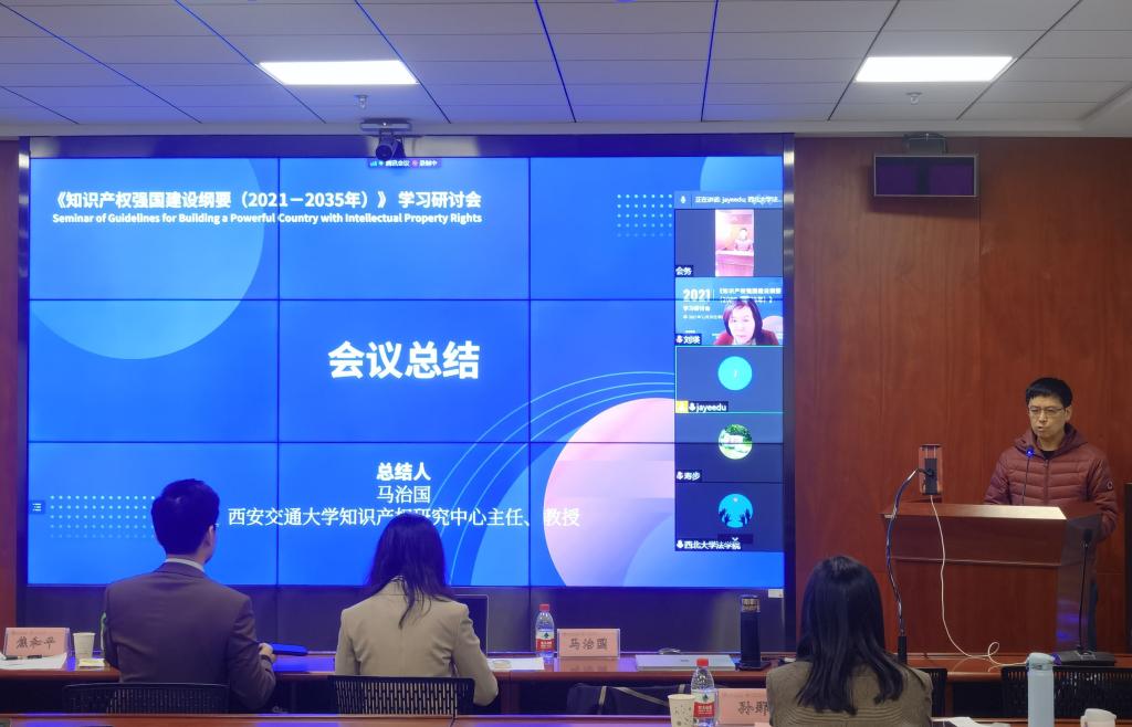 最后,马治国教授做了会议总结。他表示本次会议紧紧围绕《知识产权强国建设纲要(2021-2035)》展开,与会嘉宾分别从宏观、中观、微观三个层面对纲要内容进行了精细化、体系化的解读。易继明教授从宏观层面对纲要的重点内容进行了解读,宋晓亭教授与寿步教授分别从学科建设和法学研究范式的革命角度进行了中观层面的分享,最后关永红教授与刘瑛教授从改革教学方法和培养人才的微观角度提出了宝贵建议,各个模块与谈人的发言也深化了对主题的理解,让本次研讨会更加丰富和完善。最后,他表示在新文科建设、《知识产权强国建设纲要》和十九届六中全会百年决议的大背景下,本次研讨会的召开对我校乃至我国的知识产权学科发展具有重要意义,期待知识产权法学与科技法学等学科在新时代和新机遇背景下能够获得更大更好的发展。