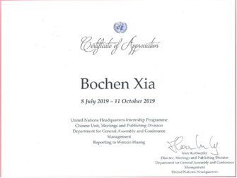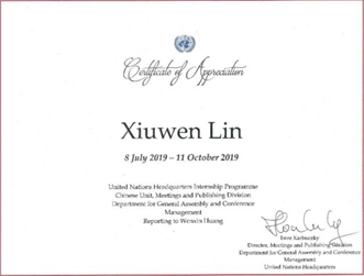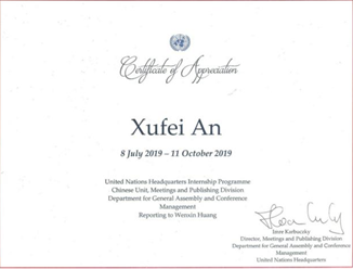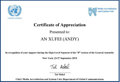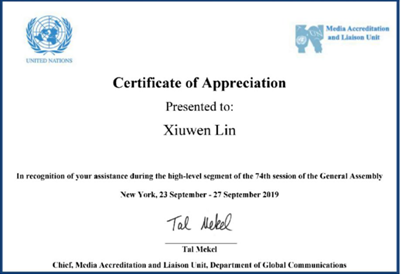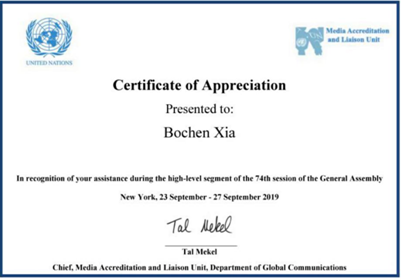 实习期间正值第74届联合国大会的召开,我校三名实习生有幸承担了联合国秘书长工作报告中文译本的编校工作,并通过了联合国全球传播部的选拔成为本届大会的志愿者,荣获“优秀志愿者证书”。英国上市公司官网365博士生夏伯琛感言:“终于有机会可以为祖国做一点力所能及的事,我们会主动引导前来参会的中国代表和媒体到达指定会场。最激动人心的是现场聆听国务委员王毅和联合国秘书长古特雷斯在新中国成立七十周年成果图片展开幕式上的致辞,向世界各国友人分享中国发展进步的辉煌成就。作为一名中国志愿者,强烈的民族自豪感油然而生!”